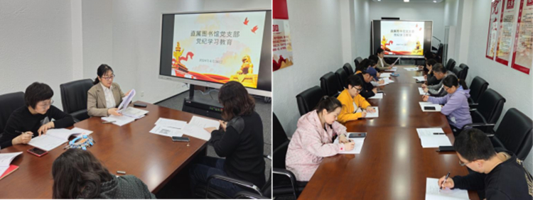 4月16日,直属图书馆党支部集中学习了《中国共产党纪律处分条例》《<深入推进党的自我革命 坚决打赢反腐败斗争攻坚战持久战>——习近平在二十届中央纪委三次全会上发表的重要讲话》《中国共产党廉洁自律准则》;直属图书馆党支部理论学习中心组集中学习了高向辉书记在学校党纪学习教育第1期读书班暨2024年第3次党委理论学习中心组集体学习扩大会议上的讲话精神。
